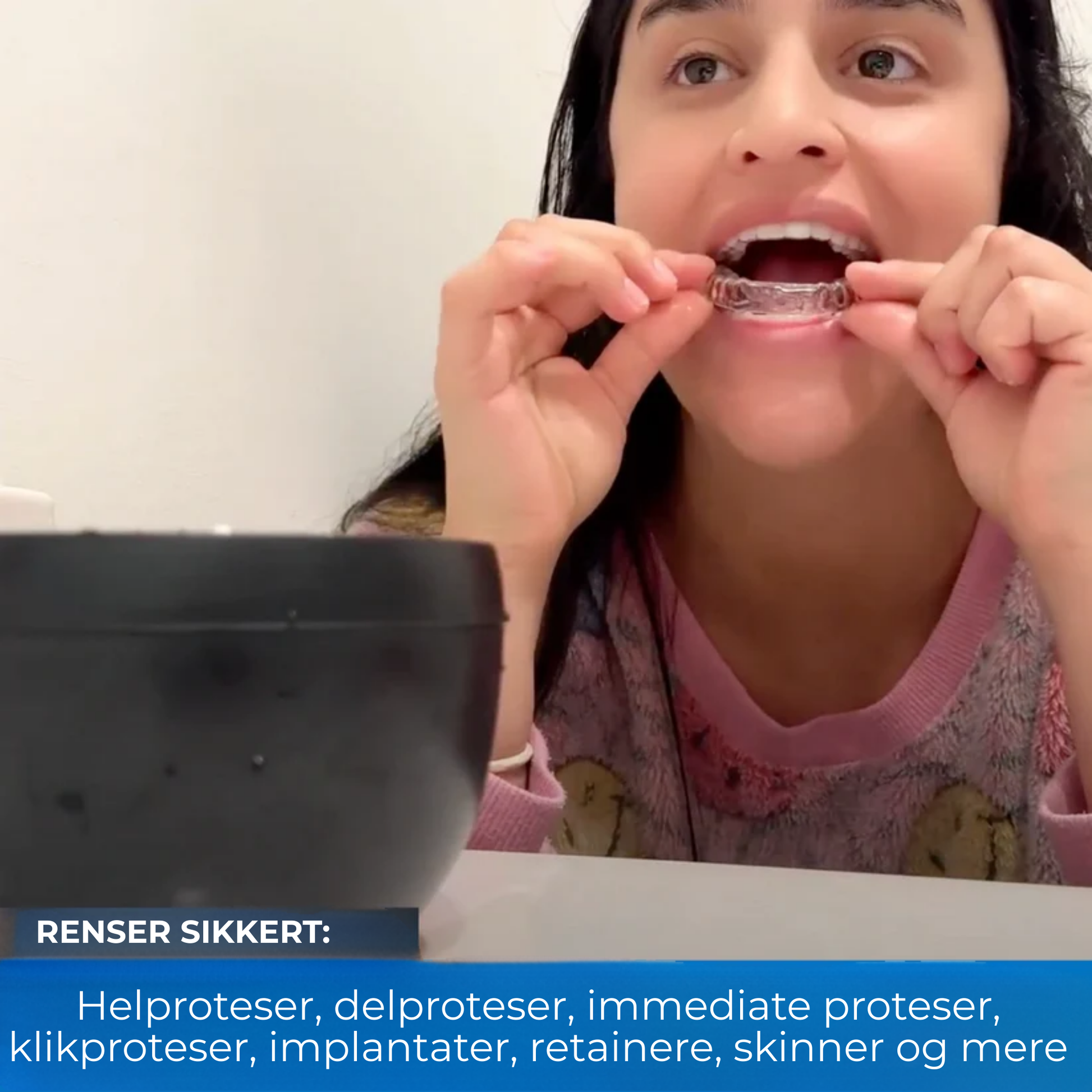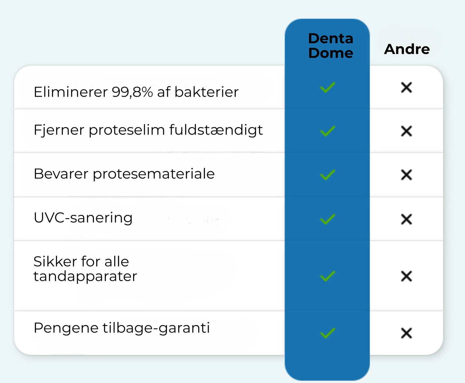 Børstning og iblødsætning er ikke tilstrækkeligt. Med tiden kan de faktisk beskadige overfladen af dine proteser – hvilket gør det lettere for bakterier at gemme sig og sværere at holde tingene helt rene. Denta Dome er designet til at bevare dine proteser, mens den leverer en klinisk renhed derhjemme. Det er den samme avancerede teknologi, der bruges på tandlægeklinikker – nu gjort enkel nok til daglig brug på din bordplade.
