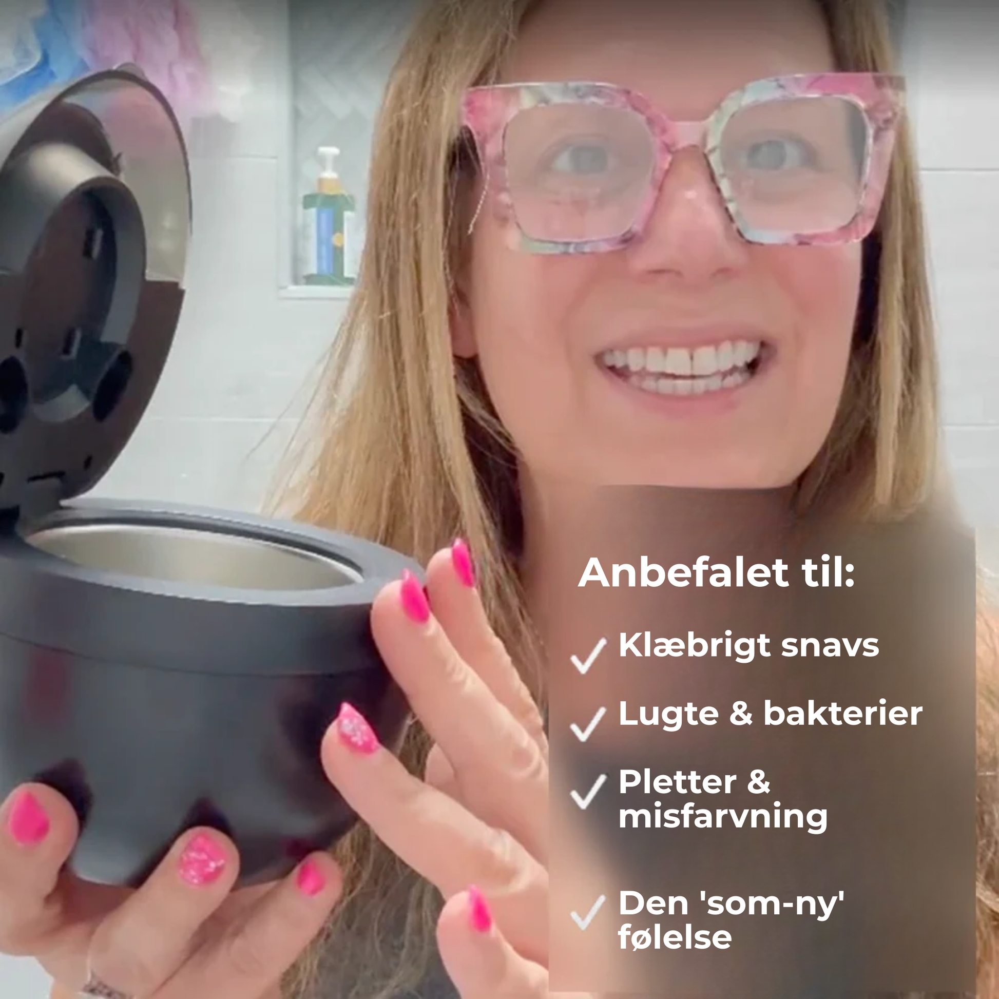 Selvom dine proteser ser rene ud, kan usynlige bakterier stadig gemme sig i mikroskopiske riller – hvilket med tiden forårsager lugt, pletter, irritation og endda systemiske sundhedsrisici. Denta Dome bruger ultralydsbølger til at løsne snavs og plak fra hver sprække, mens UV-C lys dræber op til 99,99 % af resterende bakterier. Alt sammen på bare 5 minutter. Ingen skrubning. Ingen skrappe kemikalier. Bare friskere, sikrere proteser – hver eneste dag.