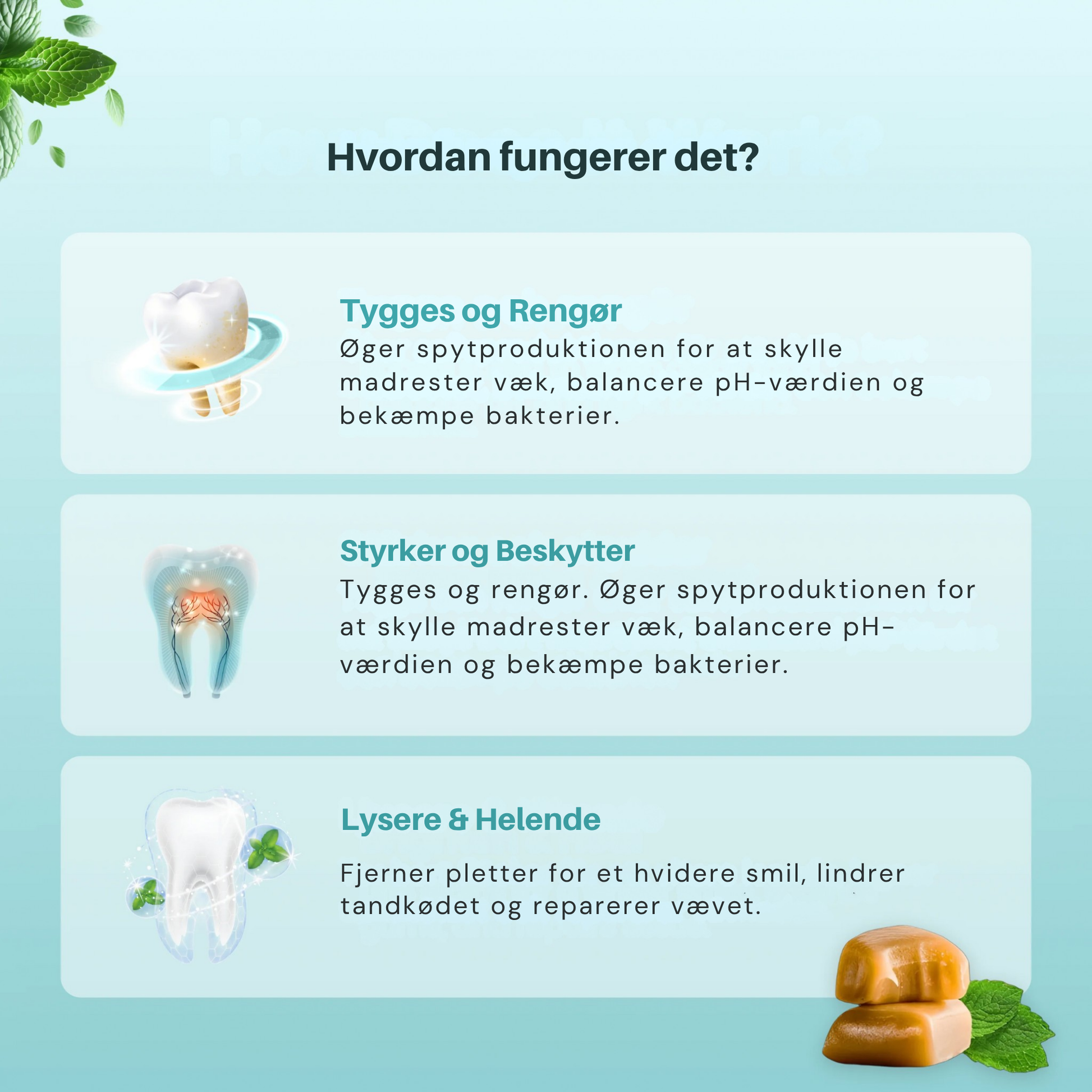 Mintara™ hjælper med at styrke og beskytte din emalje ved hvert tyg. Vores avancerede formel remineraliserer og styrker tændernes beskyttende overfladelag, forebygger karies og bidrager til at bevare en optimal mundhygiejne.