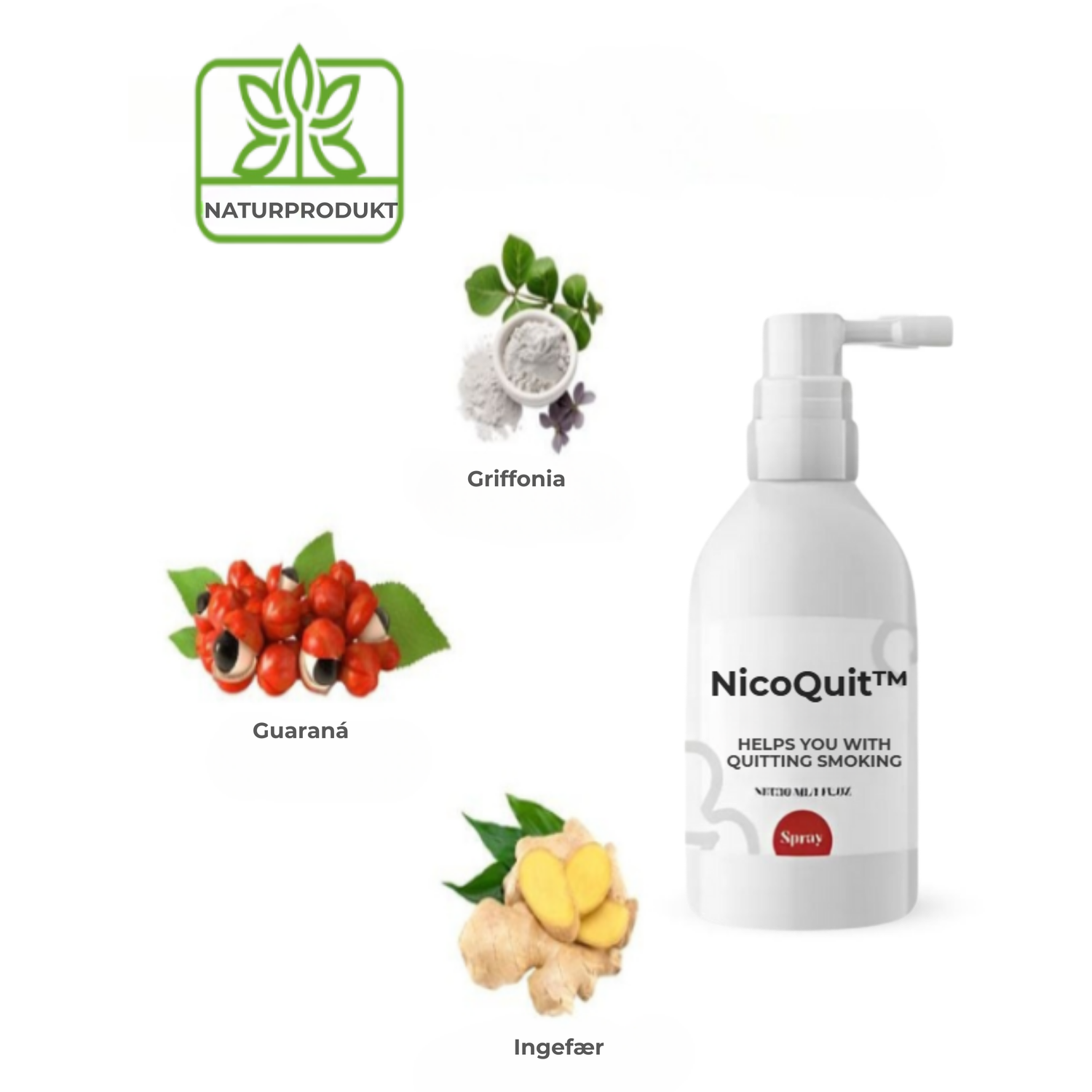 NicoQuit™-sprayen virker ved hjælp af en kraftfuld blanding af naturlige ingredienser som Griffonia, guarana og ingefær. Disse reducerer trang, lindrer abstinenssymptomer og renser lungerne for nikotin. Fra den første spray blokerer den trangen til at ryge og hjælper dig med at stoppe hurtigt og effektivt